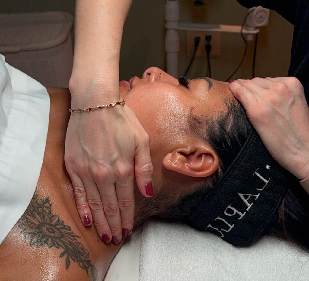 The session starts with a double cleanse and exfoliation, followed by detailed extractions. Then, rhythmic lymphatic drainage techniques are used to release fluid buildup and promote detoxification.